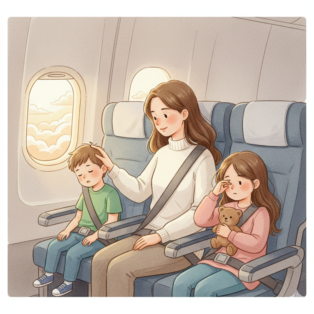 清晨五點,飛機準備降落。我輕輕把兩個孩子搖醒,低聲說:「要準備降落了,寶貝們。」他們迷迷糊糊地眨著眼,抱著小毯子坐起來,沒有哭鬧,沒有發脾氣。